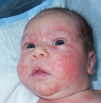 Moja ćerka je rodila devojčicu 4. novebra 2013. godine. Posle 2 nedelje od porođaja otišla je u bolnicu sa visokom temperaturom. Počeli su da je špricaju sa antibioticima, da joj obaraju temperaturu. Sve to vreme nastavila je da doji ćerku. Kao rezultat devojčica je dobila strašan osip (slika prva), na šta je dečiji lekar kazao da je to alergija i da je potrebno da dete prima lekove (kontraindikacije za te lekove su me dovele do užasa). Ja poznajem proizvode VISION već više godina i zato sam bez ikakvog straha predložila da sa njima počnemo lečenje, pogotovu što je ćerka za sve vreme trudnoće uzimala preparate VISION. Naravno za bebu je teško odrediti dozu, ali to je moguće uraditi kroz organizam majke dojilje, pa je zato mama počela da uzima Detox, Antiox, Nutimax i Junior Neo 4 puta dnevno po 1 kapsulu.